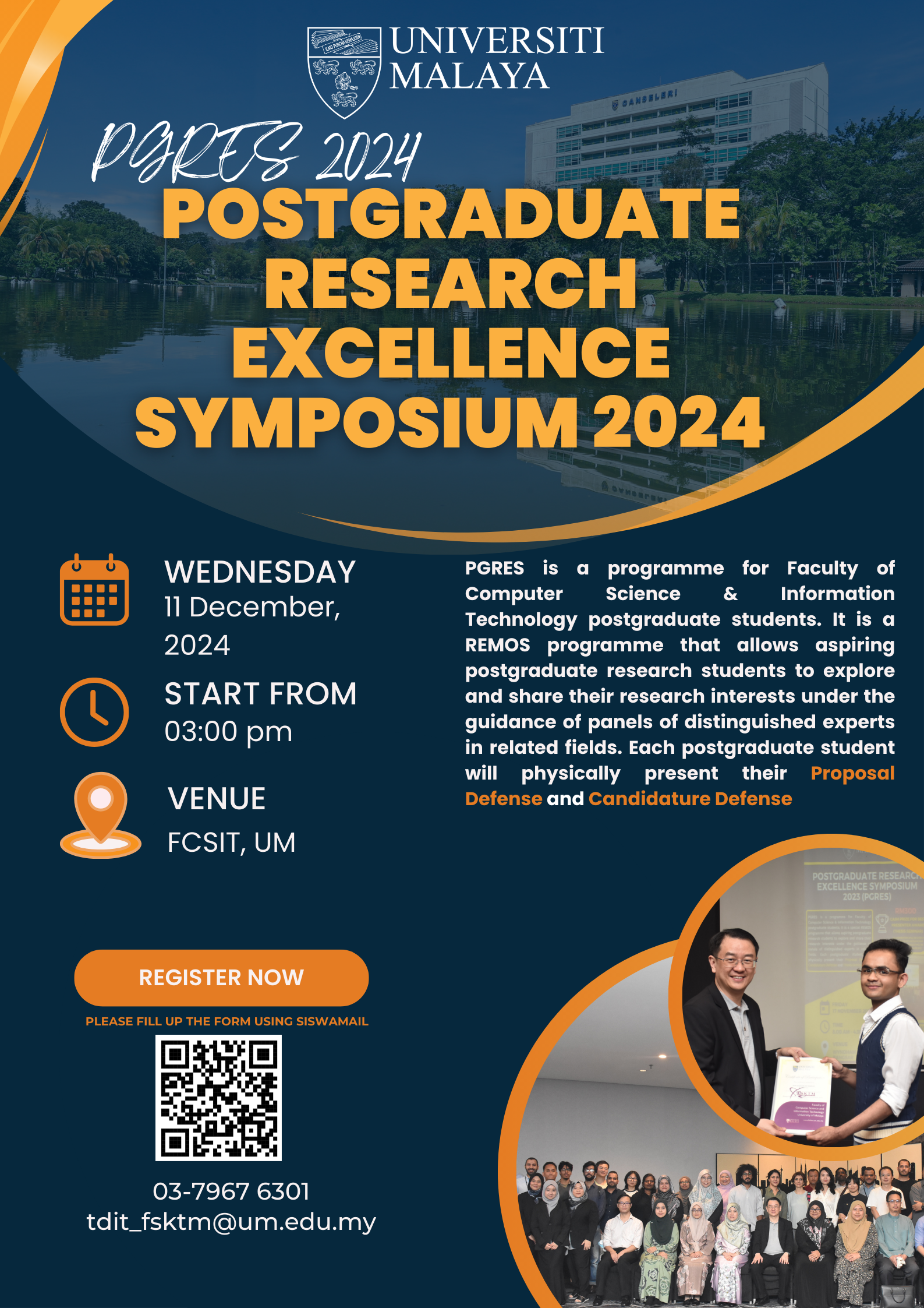 Postgraduate Research Symposium (PGRES) in an annual event which is organized by the Deputy dean of Higher Degree (Timbalan Dekan Ijazah Tinggi) of Faculty of Computer Sceinece and Information Technology (FCSIT), Universiti Malaya.