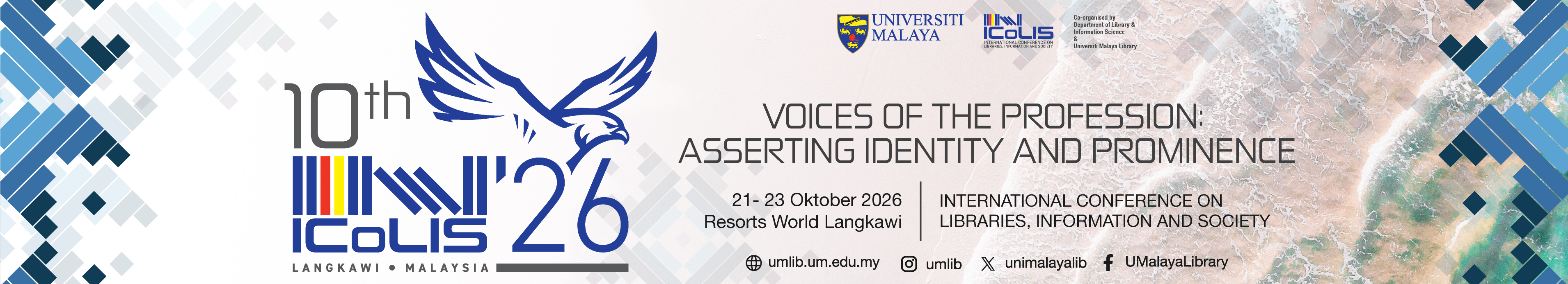 The Department of Library and Information Science, Faculty of Arts & Social Sciences, Universiti Malaya and the Universiti Malaya Library are organizing the 10th International Conference on Libraries, Information Society 2026 (ICoLIS 2026), which will held on 21st - 23rd October 2026 at Resorts World Langkawi