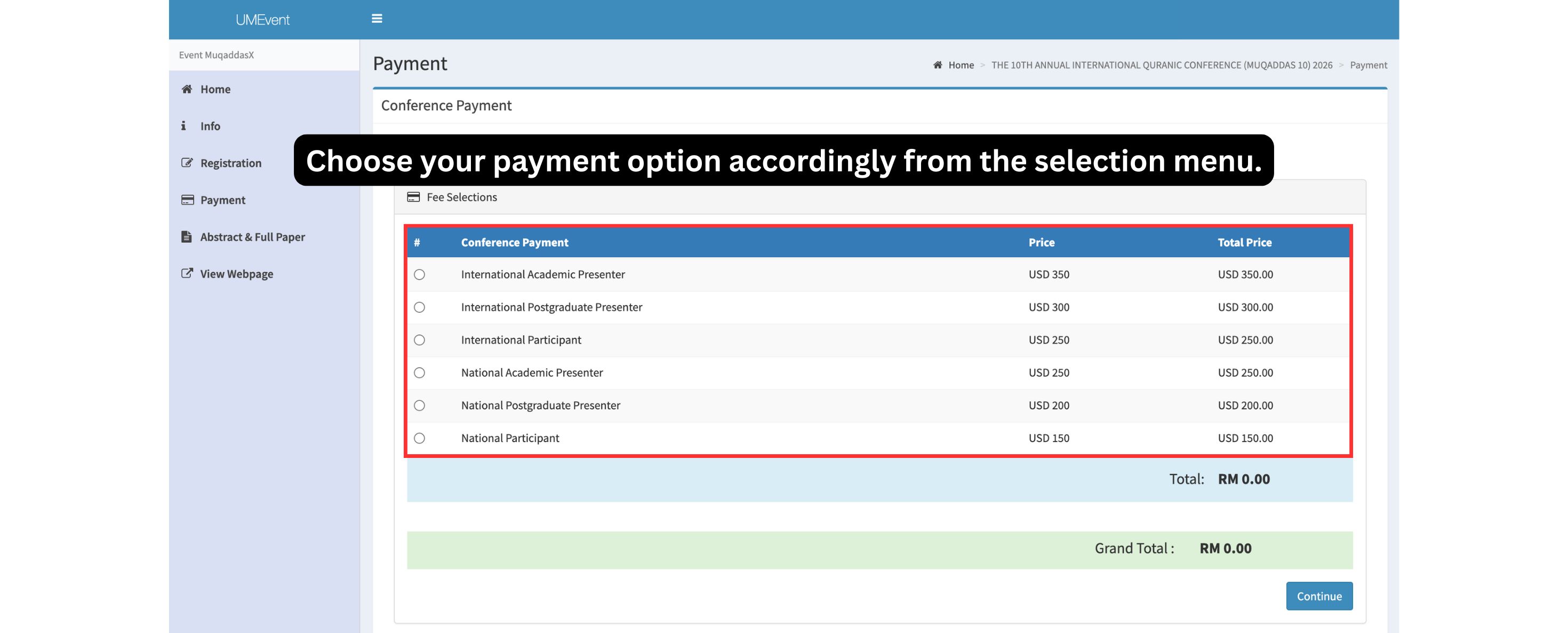 6. Choose your payment option accordingly from the selection menu.